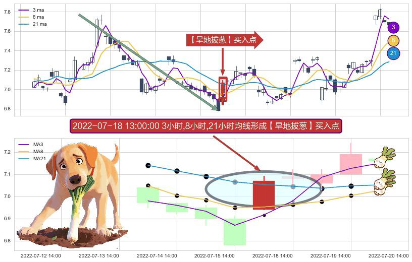 ⚀ 2022-07-18 13:00:00小时显现 3小时-8小时-21小时均线 【旱地拔葱】买入点 看多信号,后市看涨,买入