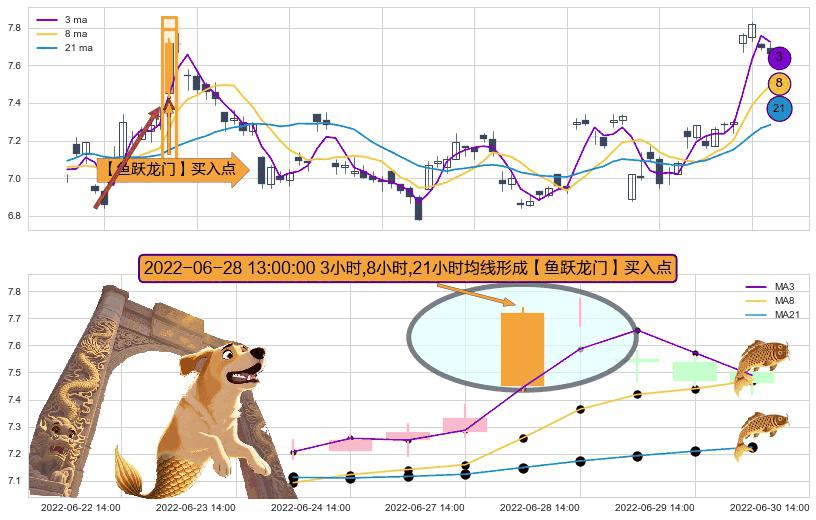 ⚀ 2022-06-28 13:00:00小时显现 3小时-8小时-21小时均线 【鱼跃龙门】买入点 看多信号,后市看涨,买入