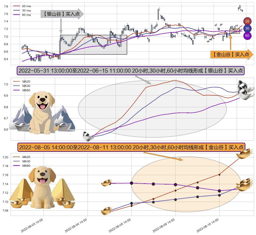 ⚃ 2022-08-09 13:00:00-小时至2022-08-11 13:00:00-小时显现 20小时-30小时-60小时均线 【金山谷】买入点 其再次确认了买入信号,可靠性更强,买入