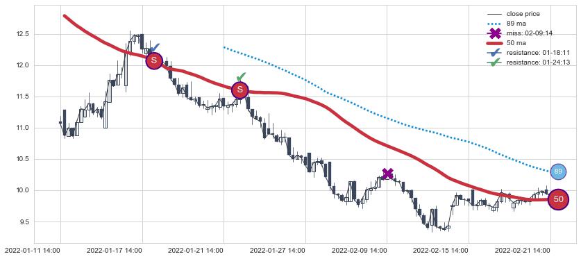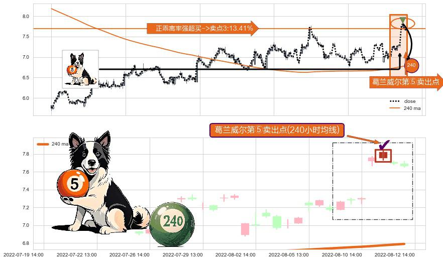 ⚀ 2022-08-11 14:00:00-小时显现 葛兰威尔均线 240小时均线 第⑤卖出点 上升趋势均值回复的短线回落信号,后市看跌,卖出信号