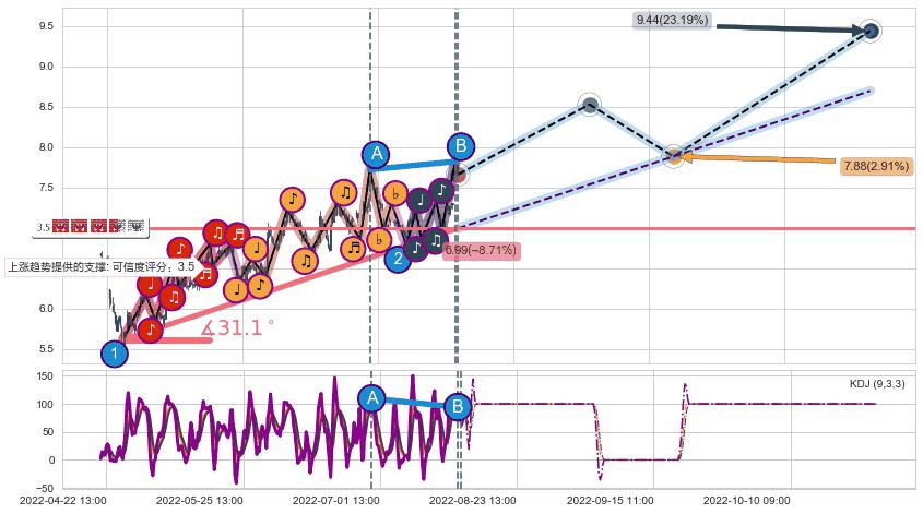 ♘ 在最后的上升阶段2022-04-27 09:00至2022-08-12 14:00存在 持续未破位的支撑位 ,支撑价格6.99,支撑可信任强度76.75%,其距离最后价格7.66相差 -8.71%