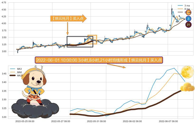 ⚀ 2022-05-27 09:00:00小时-2022-06-07 11:00:00小时显现 3小时-8小时-21小时均线 【烘云托月】买入点 看多信号,后市看涨,买入