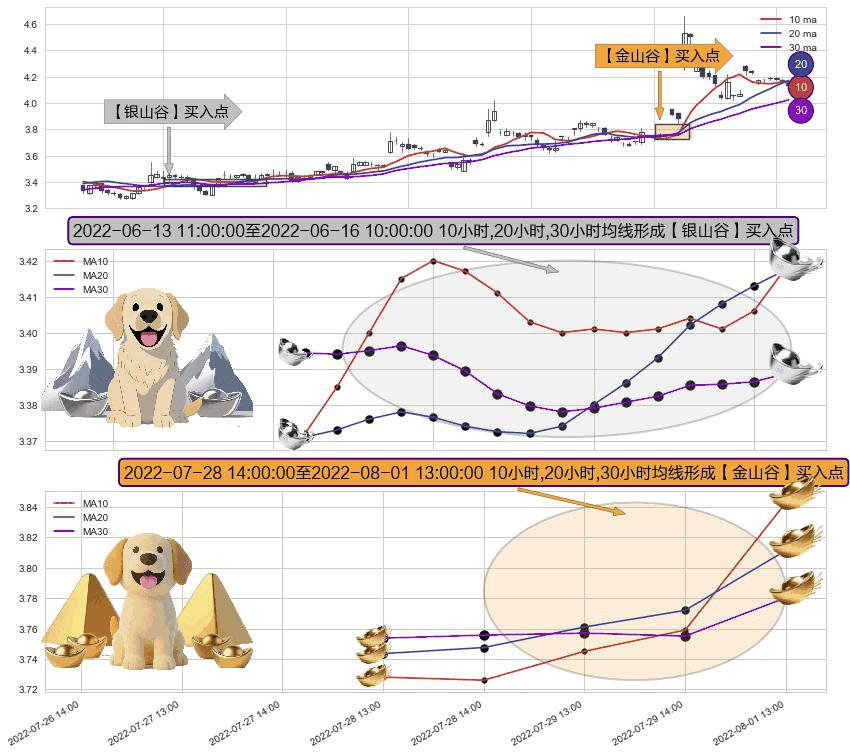 ⚃ 2022-07-29 13:00:00-小时至2022-08-01 13:00:00-小时显现 10小时-20小时-30小时均线 【金山谷】买入点 其再次确认了买入信号,可靠性更强,买入