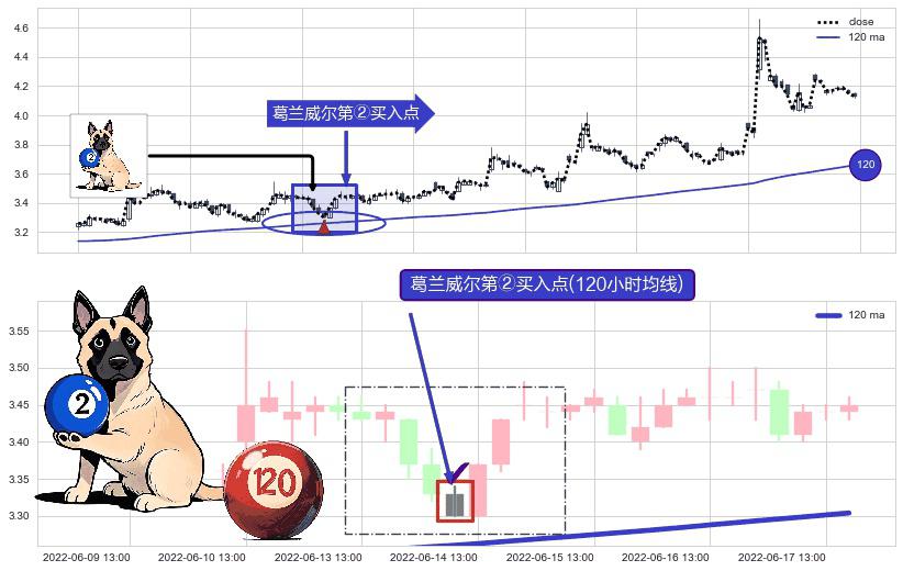 ⚀ 2022-06-14 11:00:00-小时显现 葛兰威尔均线 120小时均线 第②买入点 上升趋势的中继信号,后市看涨,买进信号