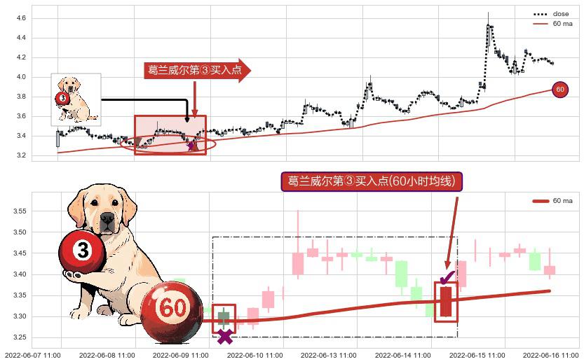 ⚀ 2022-06-14 13:00:00-小时显现 葛兰威尔均线 60小时均线 第③买入点 上升趋势的中继信号,后市看涨,买进信号