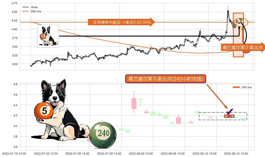 ⚀ 2022-08-11 14:00:00-小时显现 葛兰威尔均线 240小时均线 第⑤卖出点 上升趋势均值回复的短线回落信号,后市看跌,卖出信号