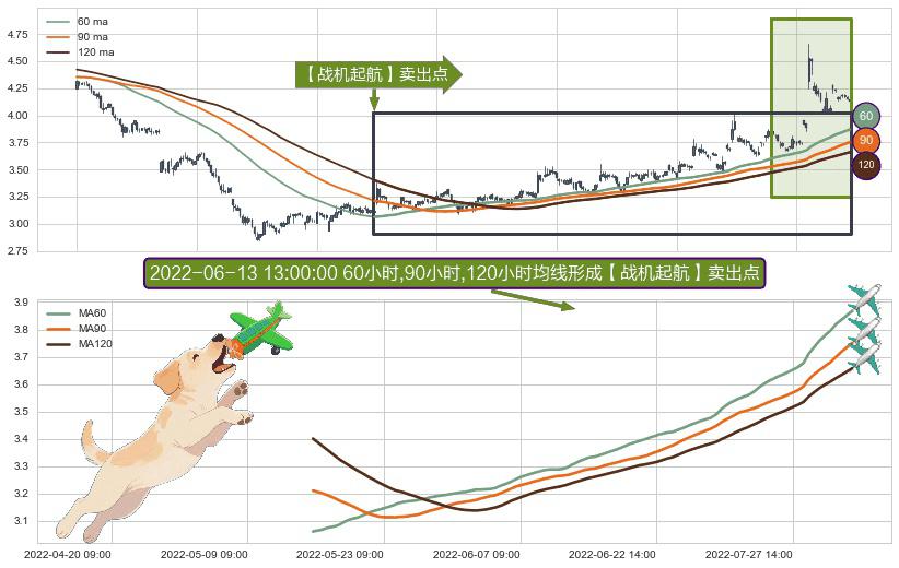 ⚀ 2022-05-13 14:00:00小时-2022-08-12 14:00:00小时显现 60小时-90小时-120小时均线 【战机起航】卖出点 看空信号,后市看跌,卖出