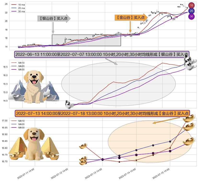 ⚂ 2022-07-14 13:00:00-小时至2022-07-18 13:00:00-小时显现 10小时-20小时-30小时均线 【金山谷】买入点 其再次确认了买入信号,可靠性更强,买入