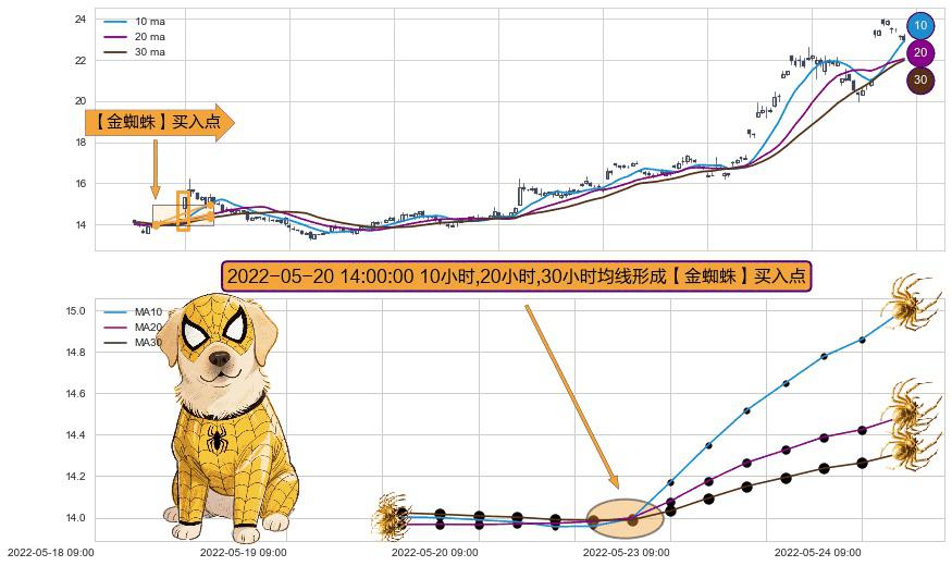 ⚀ 2022-05-20 14:00:00小时显现 10小时-20小时-30小时均线 【金蜘蛛】买入点 看多信号,后市看涨,买入