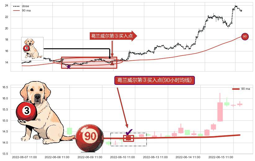 ⚀ 2022-06-10 10:00:00-小时显现 葛兰威尔均线 90小时均线 第③买入点 上升趋势的中继信号,后市看涨,买进信号
