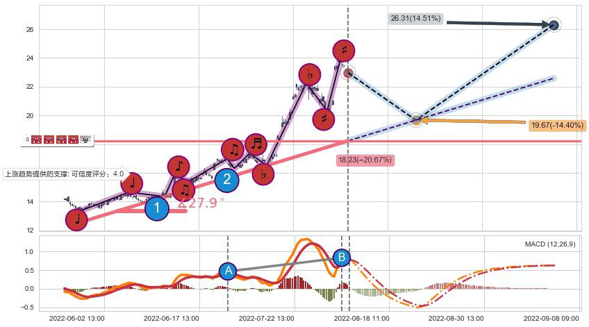 从2022-05-31 09:00至2022-08-12 14:00,共包含143个小时,阶段股价上涨56.84%,阶段股价变动位移路程比: 1 : 2,上涨趋势角度: 27.9,2022-08-09 13:00向⇪形成缺口,跳空上涨+10.37%
