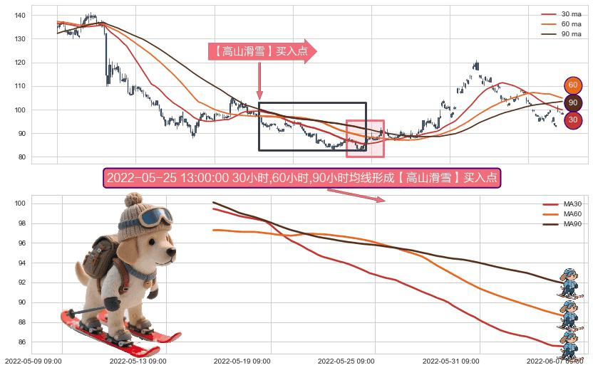 形态多维评估: ⚀ 2022-05-16 14:00:00小时-2022-06-06 10:00:00小时显现 30小时-60小时-90小时均线 【高山滑雪】买入点 看多信号,后市看涨,买入
