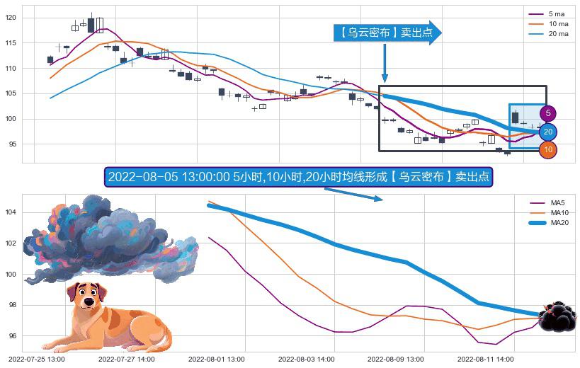 形态多维评估: ⚀ 2022-07-29 13:00:00小时-2022-08-12 14:00:00小时显现 5小时-10小时-20小时均线 【乌云密布】卖出点 看空信号,后市看跌,卖出