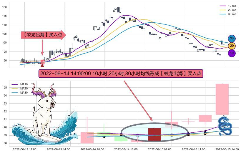 形态多维评估: ⚀ 2022-06-14 14:00:00小时显现 10小时-20小时-30小时均线 【蛟龙出海】买入点 看多信号,后市看涨,买入