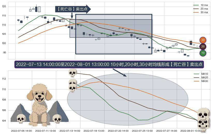 形态多维评估: ⚀ 2022-07-14 13:00:00-小时至2022-08-01 13:00:00-小时显现 10小时-20小时-30小时均线 【死亡谷】卖出点 看空信号,后市看跌,卖出