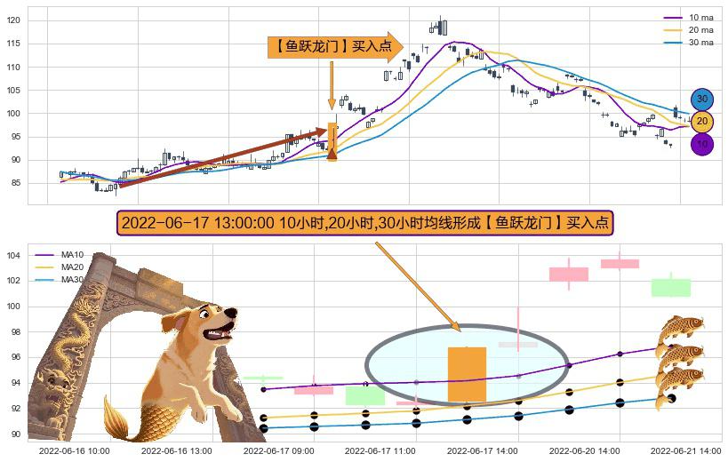 形态多维评估: ⚀ 2022-06-17 13:00:00小时显现 10小时-20小时-30小时均线 【鱼跃龙门】买入点 看多信号,后市看涨,买入