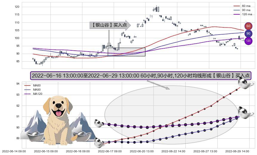形态多维评估: ⚀ 2022-06-16 14:00:00-小时至2022-06-29 13:00:00-小时显现 60小时-90小时-120小时均线 【银山谷】买入点 看多信号,后市看涨,买入