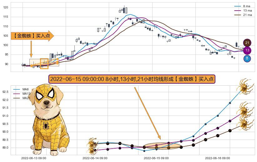 形态多维评估: ⚀ 2022-06-15 09:00:00小时显现 8小时-13小时-21小时均线 【金蜘蛛】买入点 看多信号,后市看涨,买入