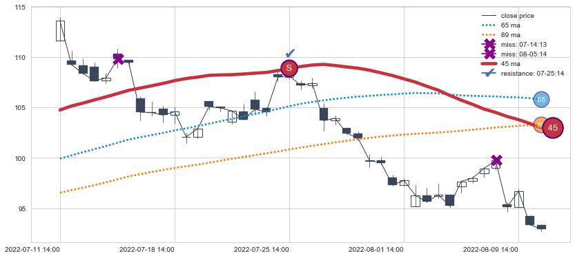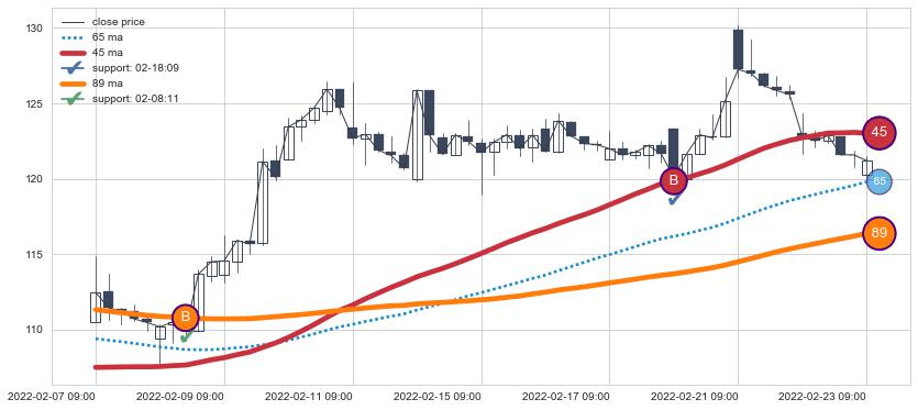 上涨趋势06-07 14:00-07-26 14:00,均线89, 65, 45确认关键支撑3处