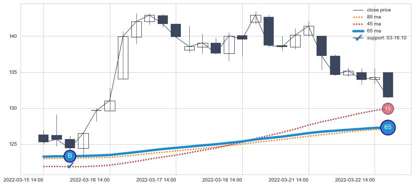 上涨趋势03-15 14:00-03-23 09:00,均线65确认关键支撑1处