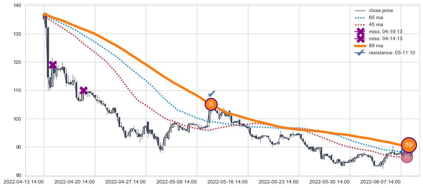 下跌趋势04-13 14:00-06-07 14:00,均线89确认关键阻力1处