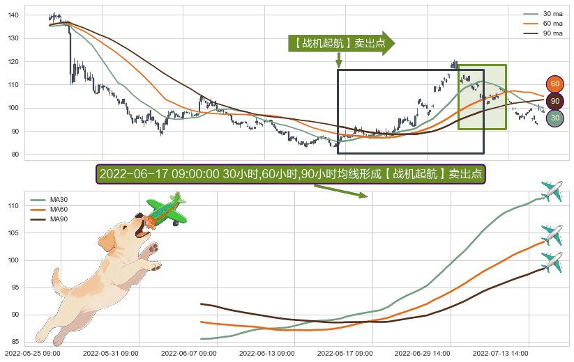 形态多维评估: ⚀ 2022-06-06 10:00:00小时-2022-07-15 14:00:00小时显现 30小时-60小时-90小时均线 【战机起航】卖出点 看空信号,后市看跌,卖出