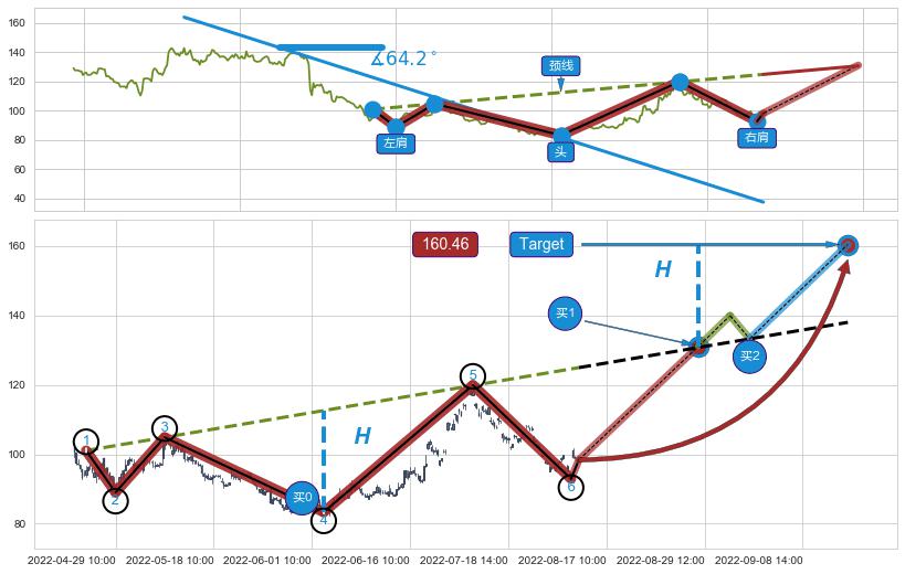 ➢ 颈线向上倾斜角度【较大】,【右肩】大幅度高于【左肩】, 反转向上可信度以及持续性【极高】