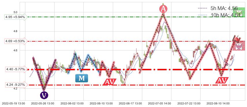 ♘ 阻力价格位4.95,可信任强度54.89%,距离最后交易2022-08-12 14:00形成的收盘价格4.67相差 +5.94%