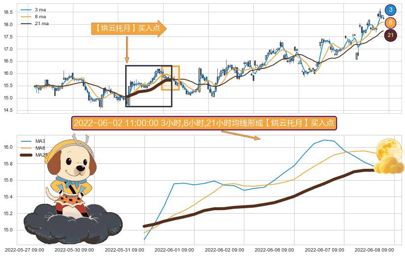 形态多维评估: ⚀ 2022-05-31 09:00:00小时-2022-06-07 14:00:00小时显现 3小时-8小时-21小时均线 【烘云托月】买入点 看多信号,后市看涨,买入