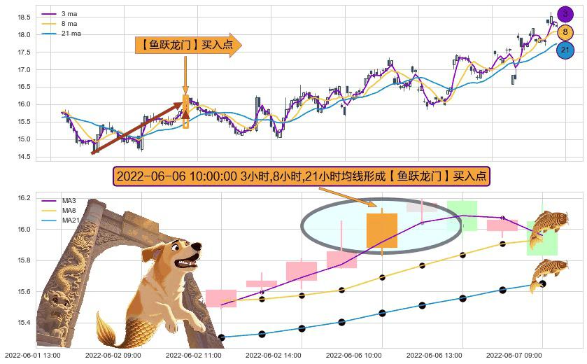 形态多维评估: ⚀ 2022-06-06 10:00:00小时显现 3小时-8小时-21小时均线 【鱼跃龙门】买入点 看多信号,后市看涨,买入