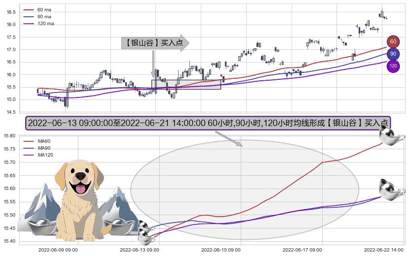形态多维评估: ⚀ 2022-06-13 10:00:00-小时至2022-06-21 14:00:00-小时显现 60小时-90小时-120小时均线 【银山谷】买入点 看多信号,后市看涨,买入