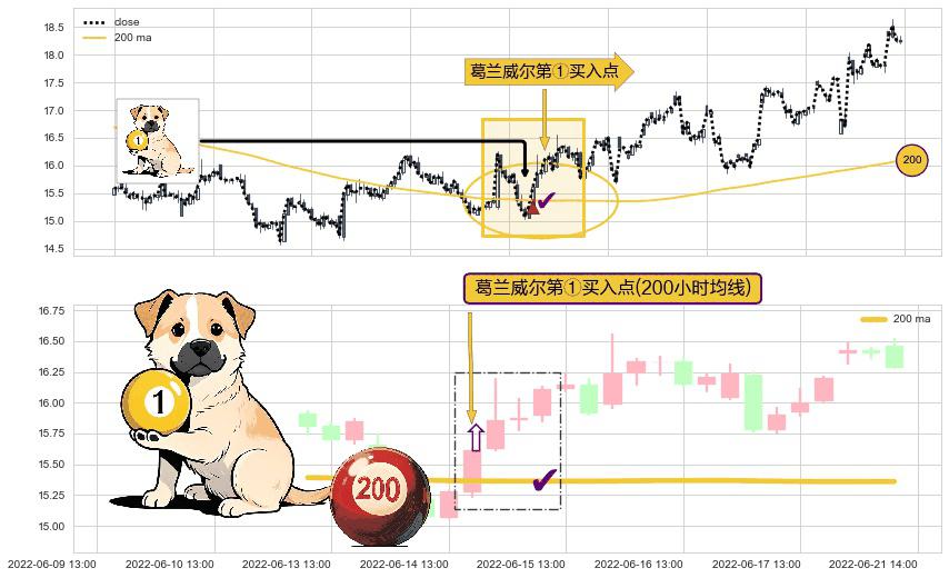 形态多维评估: ⚀ 2022-06-14 14:00:00-小时显现 葛兰威尔均线 200小时均线 第买①入点 走势反转见底信号,后市看涨,买进信号