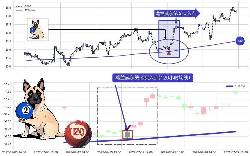 形态多维评估: ⚀ 2022-07-15 14:00:00-小时显现 葛兰威尔均线 120小时均线 第②买入点 上升趋势的中继信号,后市看涨,买进信号