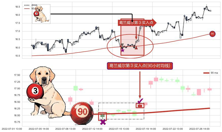 形态多维评估: ⚀ 2022-07-18 13:00:00-小时显现 葛兰威尔均线 90小时均线 第③买入点 上升趋势的中继信号,后市看涨,买进信号