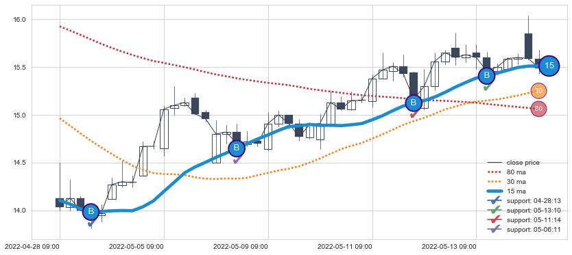 上涨趋势04-26 11:00-05-16 10:00,均线15确认关键支撑4处