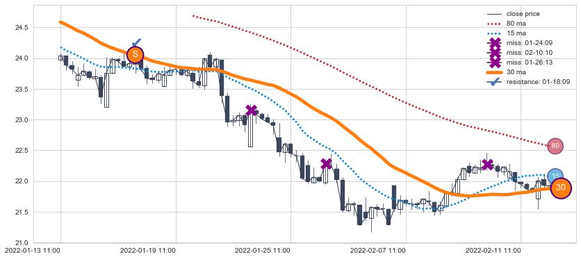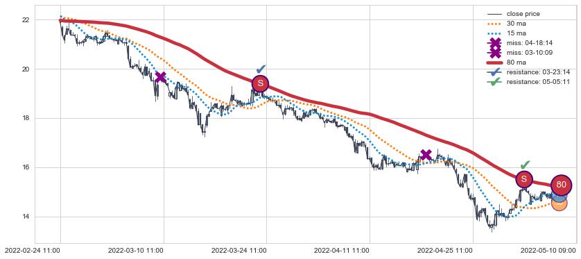 下跌趋势02-24 11:00-05-10 09:00,均线80确认关键阻力2处