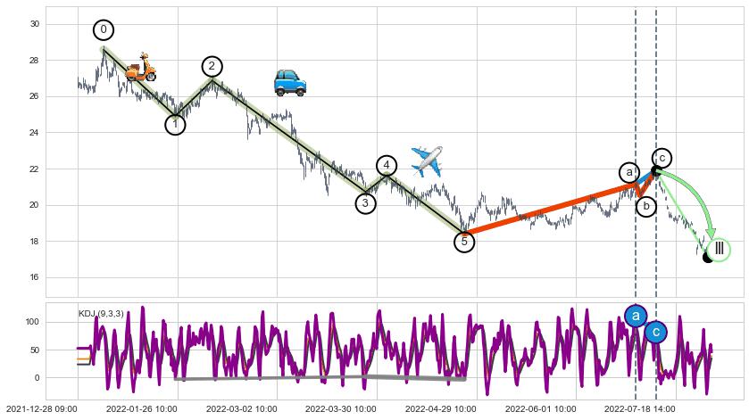 | 2 🅚:高档五阴线 ➕ 🌊:波浪理论下跌5浪延续:猜想C点强阻力小反弹终止,猜想保持下跌5浪方向下行(均值回复后大周期继续趋势跟踪) ☞ 看空信号 ⇥ 【🅚线】交织【图形】⇥ 综合量化分数: 44 | > |