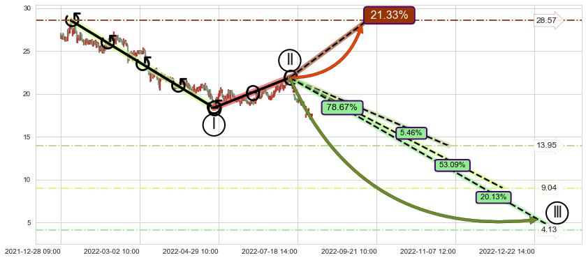 ➣ D点拟合预测价格23.64,距离最后交易收盘价格17.58相差 +34.48%