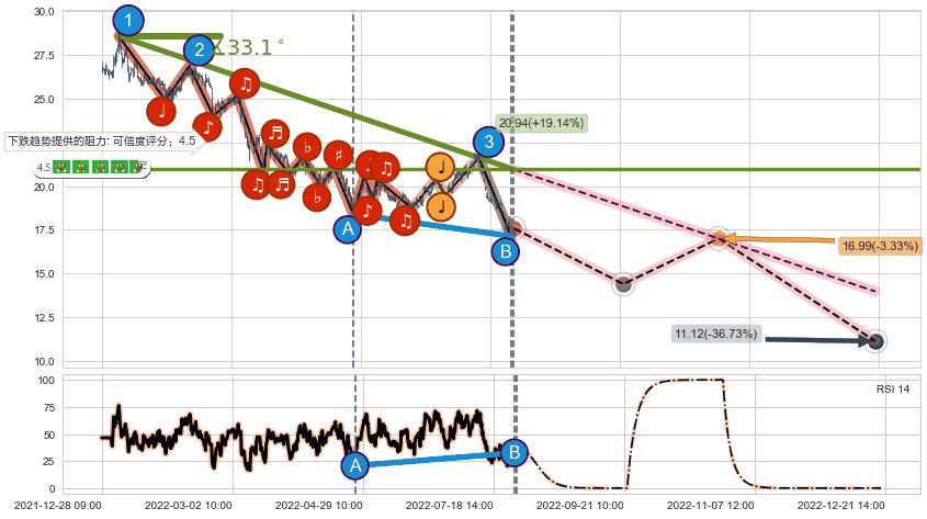 ➣ 预测:2022-10-26 12:00,【试探阻力】稳定目前下跌趋势的前提下,预测价格:16.99