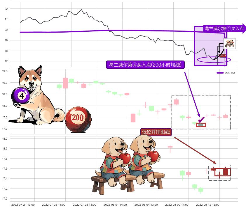 ➣ 收盘价(08-04:13: 17.75 )→回踩→第一根k线高点(08-02:14: 17.80 )