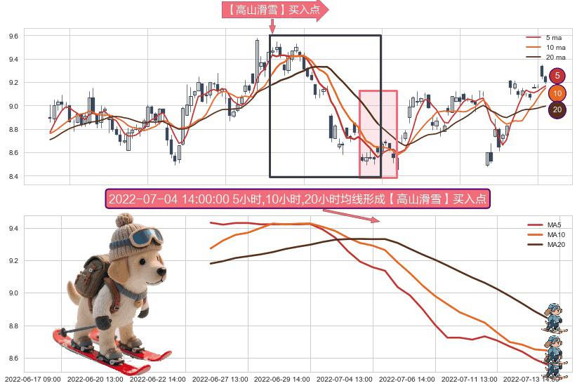⚀ 2022-06-23 14:00:00小时-2022-07-13 13:00:00小时显现 5小时-10小时-20小时均线 【高山滑雪】买入点 看多信号,后市看涨,买入