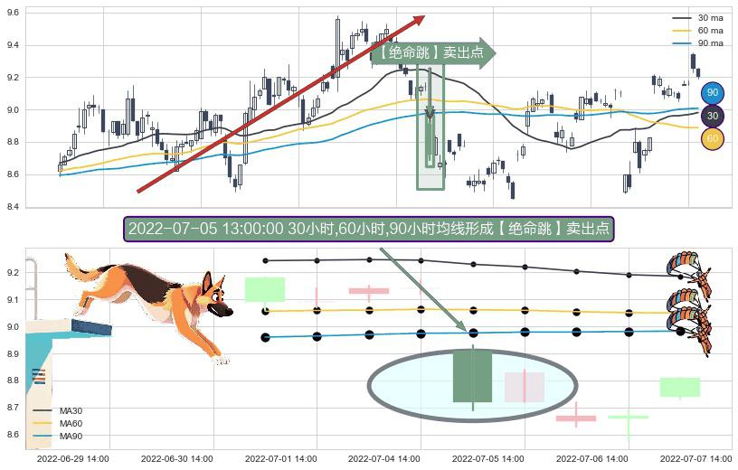 ⚀ 2022-07-05 13:00:00小时显现 30小时-60小时-90小时均线 【绝命跳】卖出点 看空信号,后市看跌,卖出