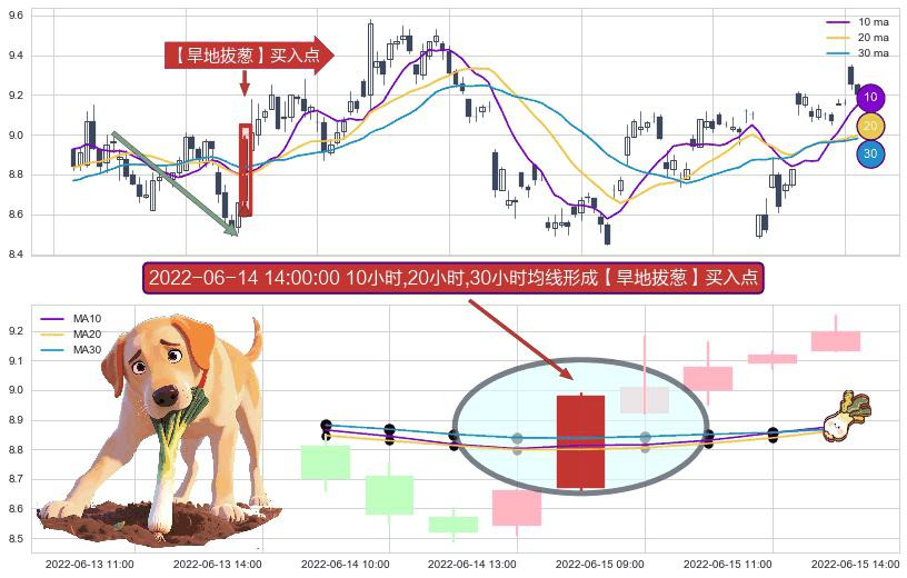 ⚀ 2022-06-14 14:00:00小时显现 10小时-20小时-30小时均线 【旱地拔葱】买入点 看多信号,后市看涨,买入
