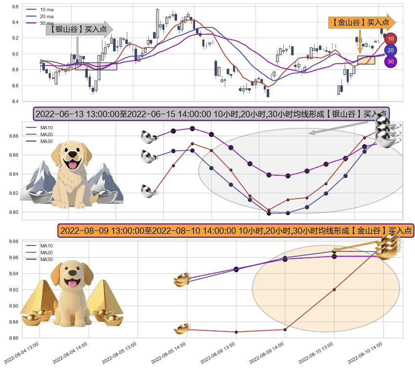 ⚃ 2022-08-09 14:00:00-小时至2022-08-10 14:00:00-小时显现 10小时-20小时-30小时均线 【金山谷】买入点 其再次确认了买入信号,可靠性更强,买入