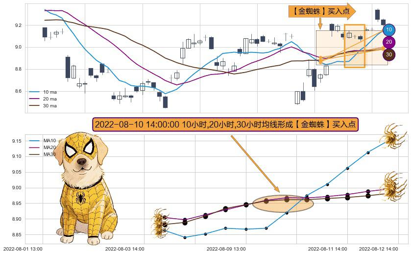 ⚀ 2022-08-10 14:00:00小时显现 10小时-20小时-30小时均线 【金蜘蛛】买入点 看多信号,后市看涨,买入