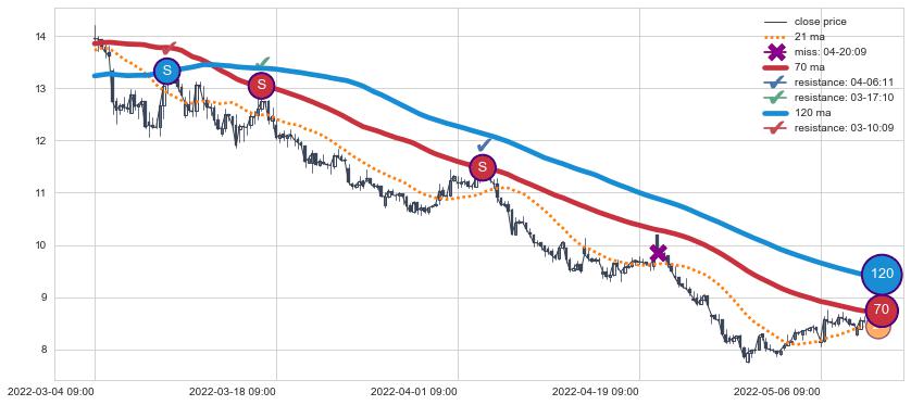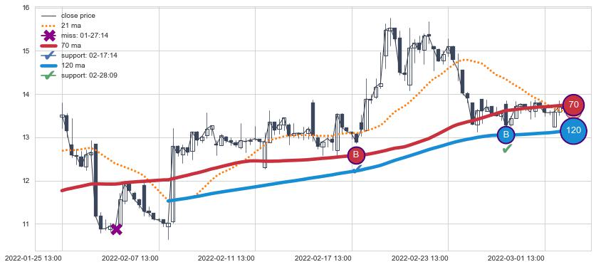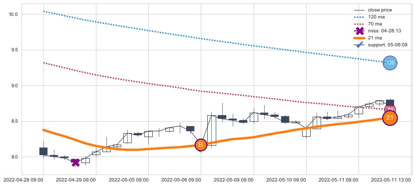 ⚂ 2022-07-05 13:00:00-小时均线向下破位,2022-08-05 13:00:00-小时重新上穿突破均线,均线支撑再次生效