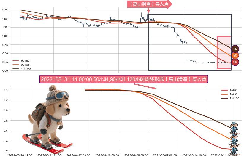 ⚀ 2022-04-11 10:00:00小时-2022-06-21 14:00:00小时显现 60小时-90小时-120小时均线 【高山滑雪】买入点 看多信号,后市看涨,买入