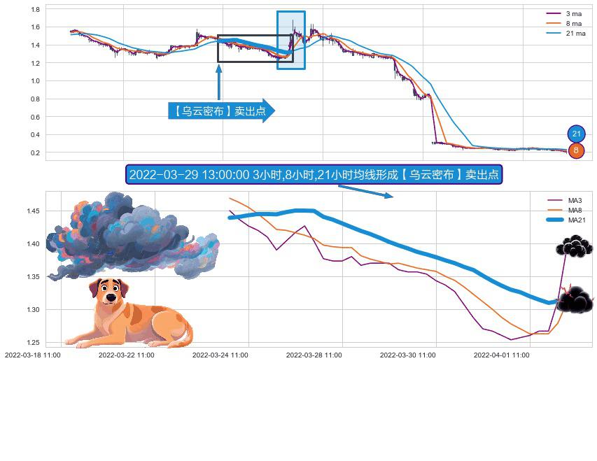 ⚀ 2022-03-24 09:00:00小时-2022-04-06 10:00:00小时显现 3小时-8小时-21小时均线 【乌云密布】卖出点 看空信号,后市看跌,卖出