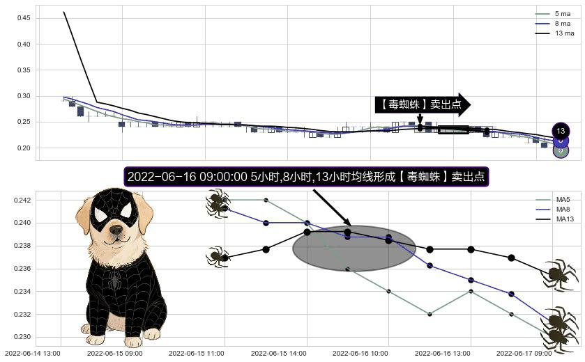 ⚀ 2022-06-16 09:00:00小时显现 5小时-8小时-13小时均线 【毒蜘蛛】卖出点 看空信号,后市看跌,卖出