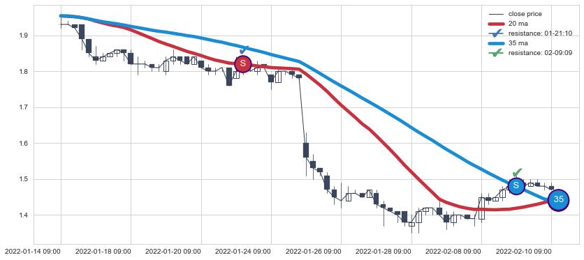 ➢ 最优均线组合共正确确认支撑阻力信号2处,正确确认率 100.00%